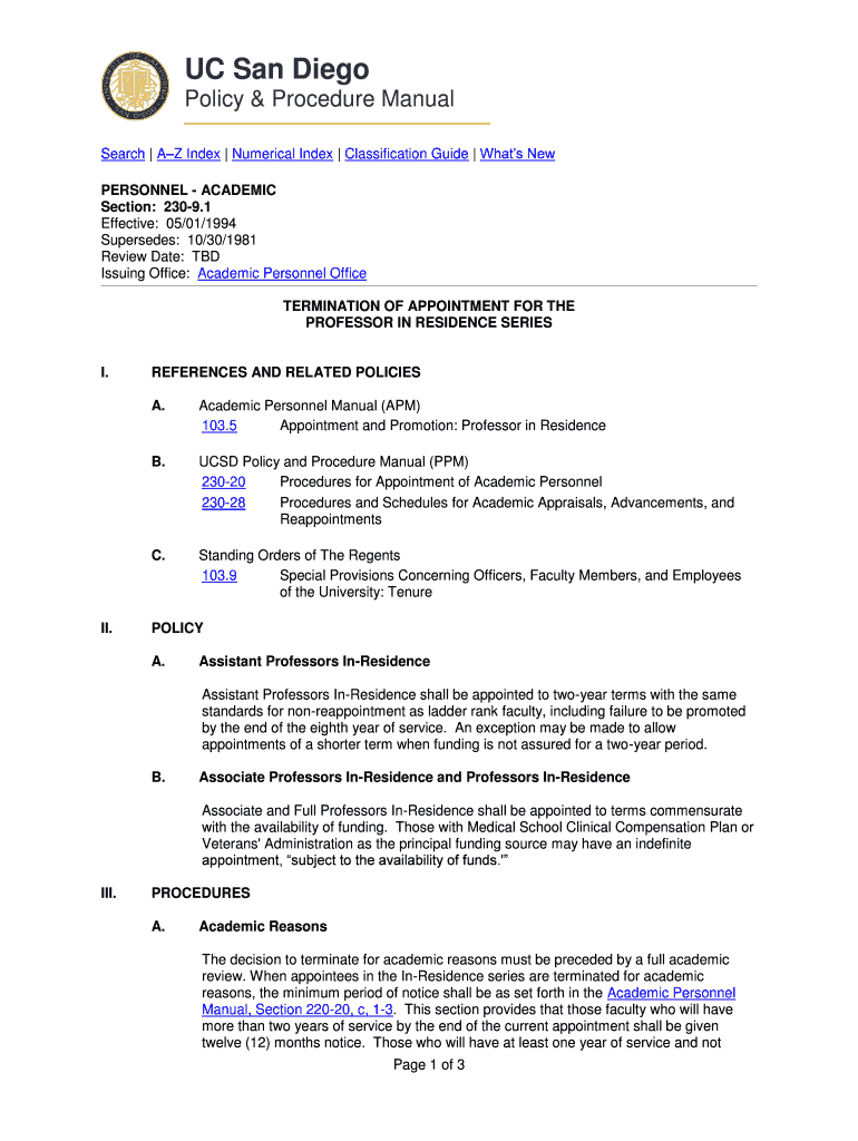 UC San Diego Policy & Procedure Manual Search AZ Index Numerical Index Classification Guide What's New PERSONNEL ACADEMIC Section: 2309.1 Effective: 05/01/1994 Supersedes: 10/30/1981 Review Date: