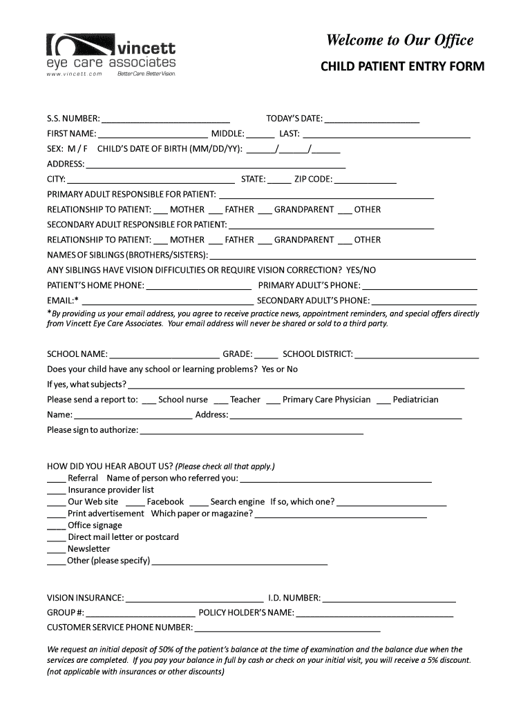 Welcome to Our Office CHILD PATIENT ENTRY FORM S.S. NUMBER: TODAYS DATE: FIRST NAME: MIDDLE: LAST: SEX: M / F CHILD DATE OF BIRTH (MM/DD/BY): / / ADDRESS: CITY: STATE: ZIP CODE: PRIMARY ADULT RESPONSIBLE