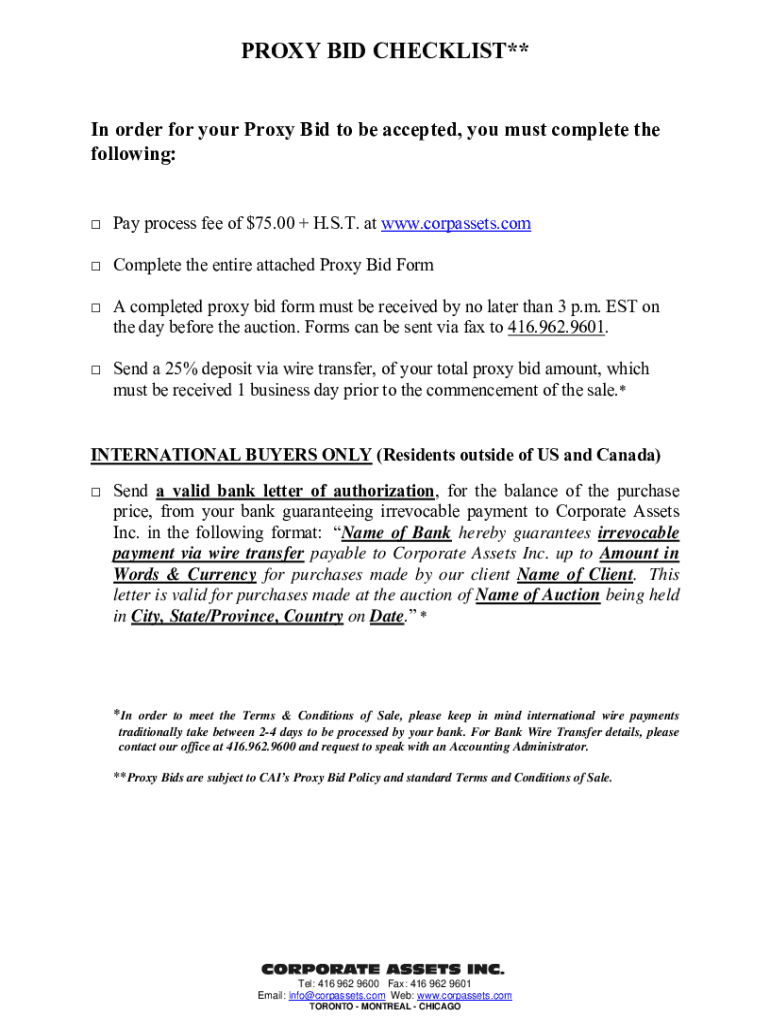 International buyers must include a bank letter of authorization guaranteeing payment along with their completed Proxy Bid Form to ensure eligibility.