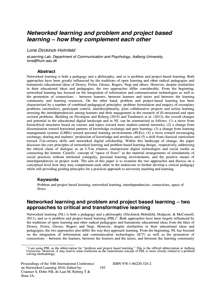 Networked learning and problem and project based learning how they complement each other Lone DirckinckHolmfeld e-learning Lab, Department of Communication and Psychology, Aalborg University, lone