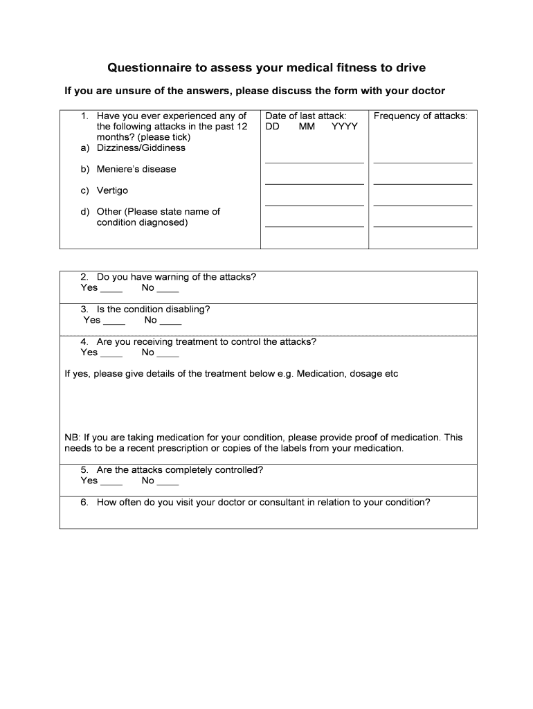 Questionnaire to assess your medical fitness to drive If you are unsure of the answers, please discuss the form with your doctor 1. Have you ever experienced any of the following attacks in the past