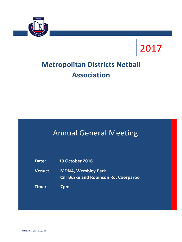 2017 Metropolitan Districts Netball Association Annual General Meeting Date: 19 October 2016 Venue: EDNA, Wembley Park CNR Burke and Robinson Rd, Coronaries Time: 7pm AGM Booklet updated 25 August