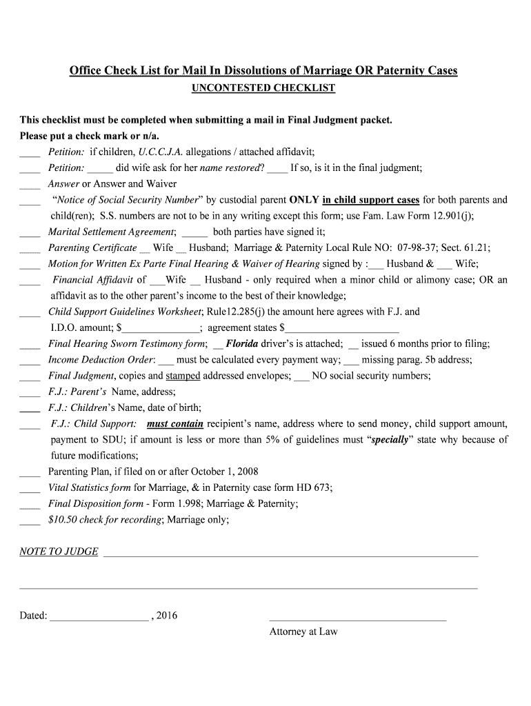 Office Check List for Mail In Dissolution of Marriage OR Paternity Cases UNCONTESTED CHECKLIST This checklist must be completed when submitting a mail in Final Judgment packet. Please put a check