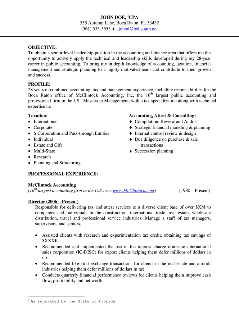 JOHN DOE, 1CPA 555 Autumn Lane, Boca Raton, FL 33432 (561) 5555555 around bell south.net OBJECTIVE: To obtain a senior level leadership position in the accounting and finance area that offers me the