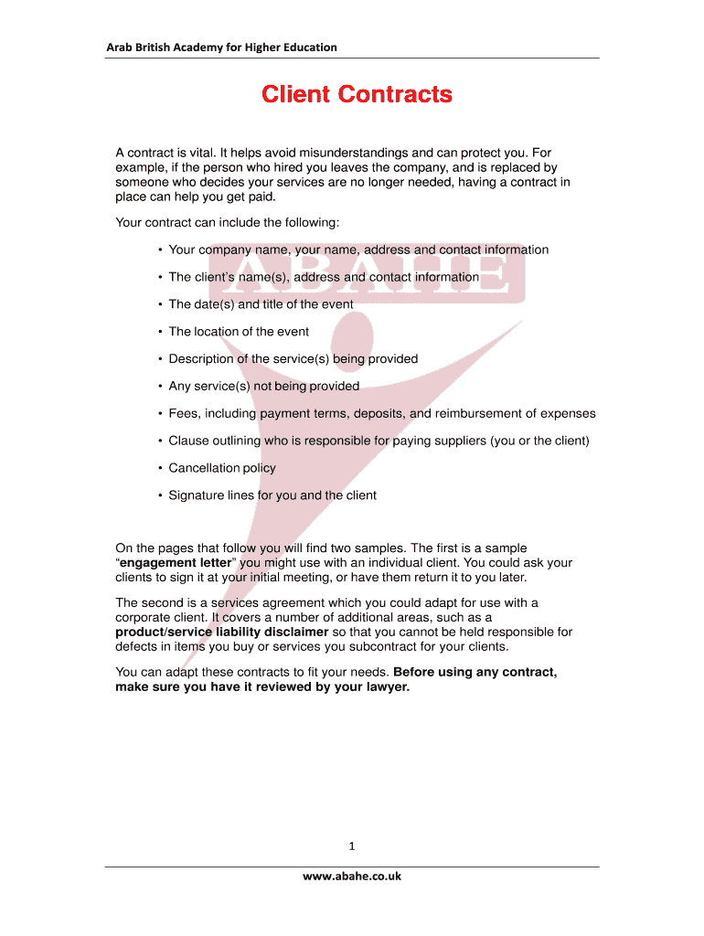 ArabBritishAcademyforHigherEducation Client Contracts A contract is vital. It helps avoid misunderstandings and can protect you. For example, if the person who hired you leave the company, and is