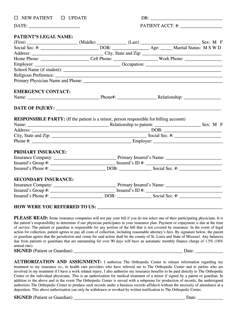 NEW PATIENT UPDATE DATE: DR: PATIENT ACCT. #: PATIENTS LEGAL NAME: (First) (Middle) (Last) Sex: M F Social Sec. #: DOB: Age: Marital Status: M S W D Address: City, State and Zip: Home Phone: Cell