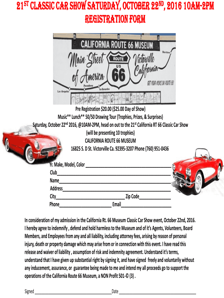 21ST CLASSIC CAR SHOW SATURDAY, OCTOBER 22ND, 2016 10AM2PM REGISTRATION FORM PRE Registration $20.00 ($25.00 Day of Show) Music** Lunch** 50/50 Drawing Tour (Trophies, Prizes, & Surprises) Saturday,