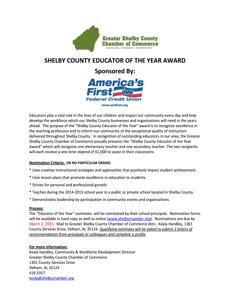 SHELBY COUNTY EDUCATOR OF THE YEAR AWARD Sponsored By: Educators play a vital role in the lives of our children and impact our community every day and help develop the workforce which our Shelby County