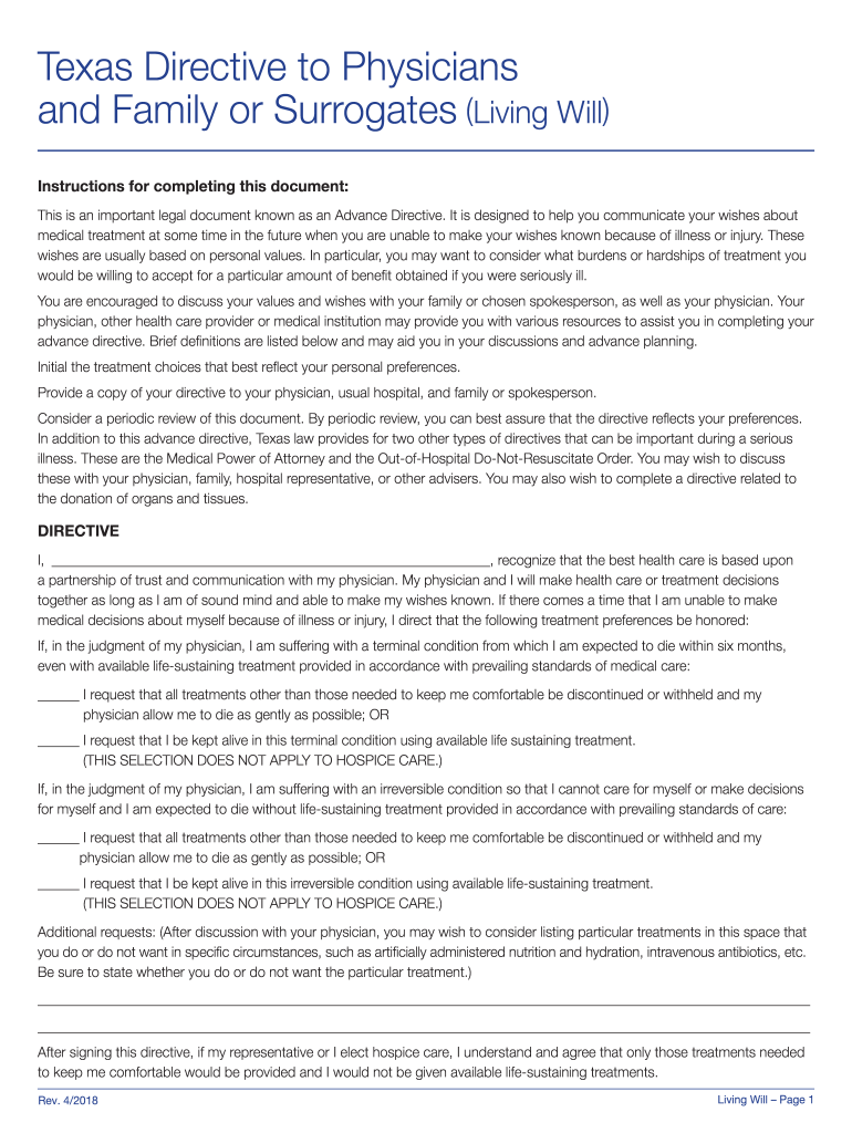 Texas Directive to Physicians and Family or Surrogates (Living Will)