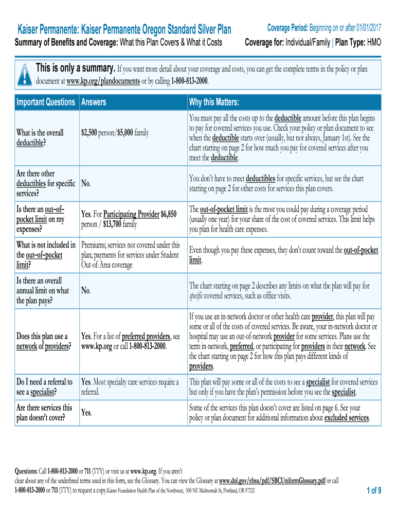 Kaiser Permanent: Kaiser Permanent Oregon Standard Silver PlanSummary of Benefits and Coverage: What this Plan Covers & What it CostsCoverage Period: Beginning on or after 01/01/2017 Coverage for: