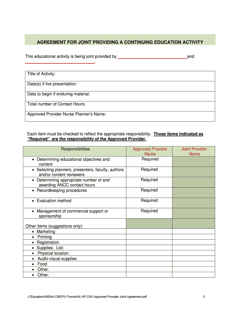 Washington State Nurses Association Approver of Continuing Nursing Education Approved Provider 2015 (current) Joint Provider Agreement AA/AP JPA Approved Providers may joint provide educational activities
