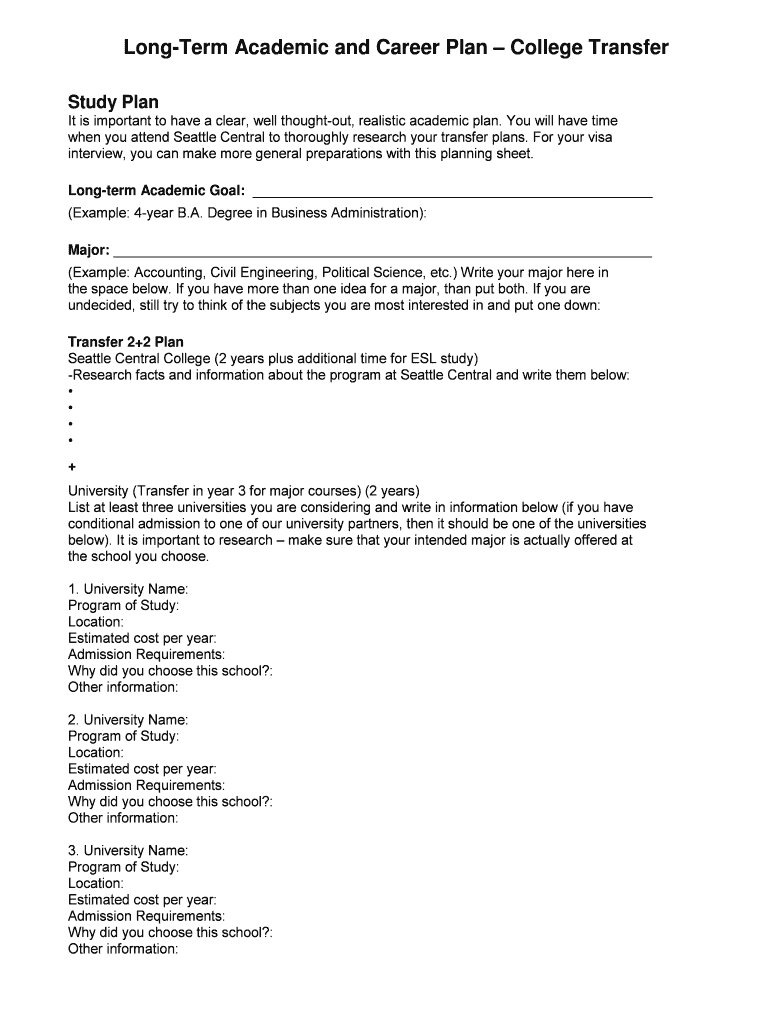 Longer Academic and Career Plan College Transfer Study Plant is important to have a clear, well though tout, realistic academic plan. You will have time when you attend Seattle Central to thoroughly