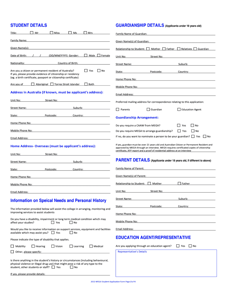 The MEGA Student Application Form serves as a crucial document for international students under the age of 18 who aspire to enroll in MEGA institutions. This form is structured to gather essential details including personal information, course selection, and guardianship arrangements. Submitting the form is vital as it initiates the admission process, ensuring prospective students can secure their place in Australian educational institutions.