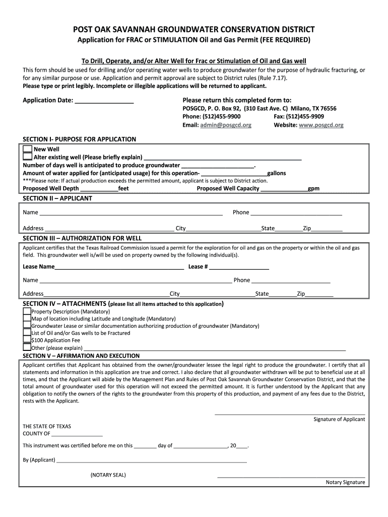 POSTOAKSAVANNAHGROUNDWATERCONSERVATIONDISTRICT ApplicationforFRACorSTIMULATIONOilandGasPermit(REQUIRED) Drill, Operate, and/orAlterWellforFracorStimulationofOilandGaswell Thisformshouldbeusedfordrillingand/oroperatingwaterwellstoproducegroundwaterforthepurposeofhydraulicfracturing,