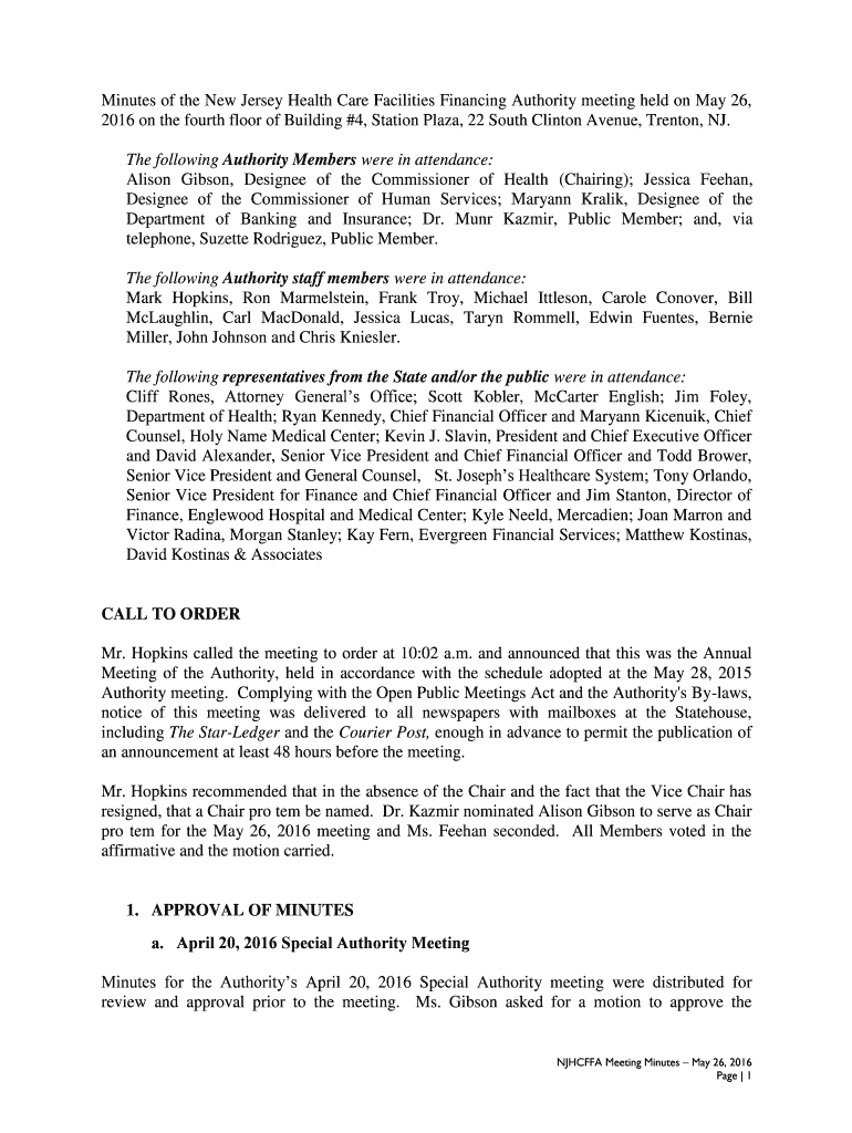 Minutes of the New Jersey Health Care Facilities Financing Authority meeting held on May 26,
