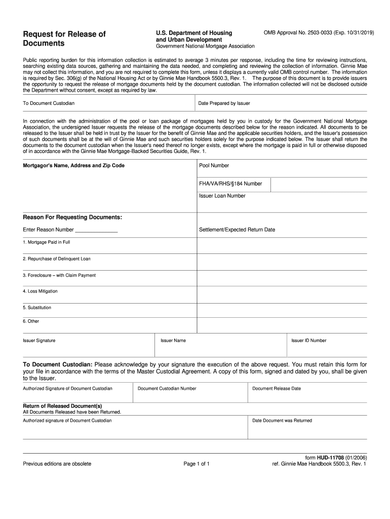 MINNIE MAE 5500.3, REV. 1 APPENDIX V5 FORM HUD 11708 REQUEST FOR RELEASE OF DOCUMENTS Applicability: Minnie Mae I MBS Program and Minnie Mae II MBS Program. Purpose: For issuers who do not file Requests