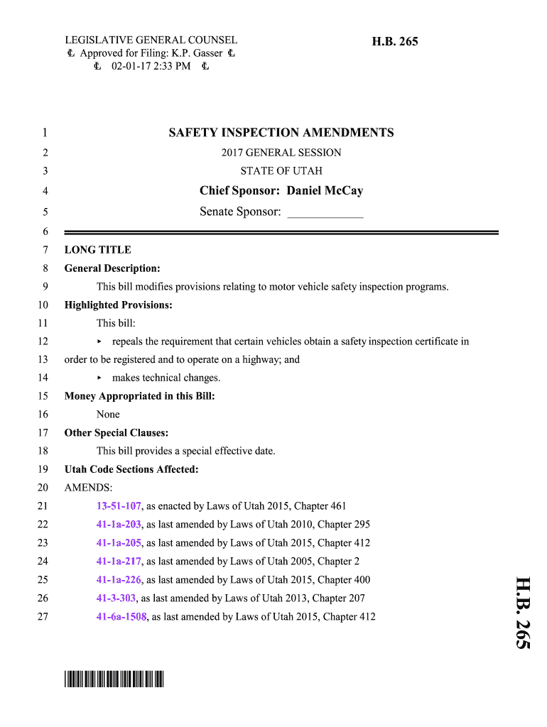 LEGISLATIVE GENERAL COUNSEL 6 Approved for Filing: K.P. Gasser 6 6 020117 2:33 PM 6H. B. 2651SAFETY INSPECTION AMENDMENTS22017 GENERAL SESSION3STATE OF UTAH4Chief Sponsor: Daniel McCay5Senate Sponsor: