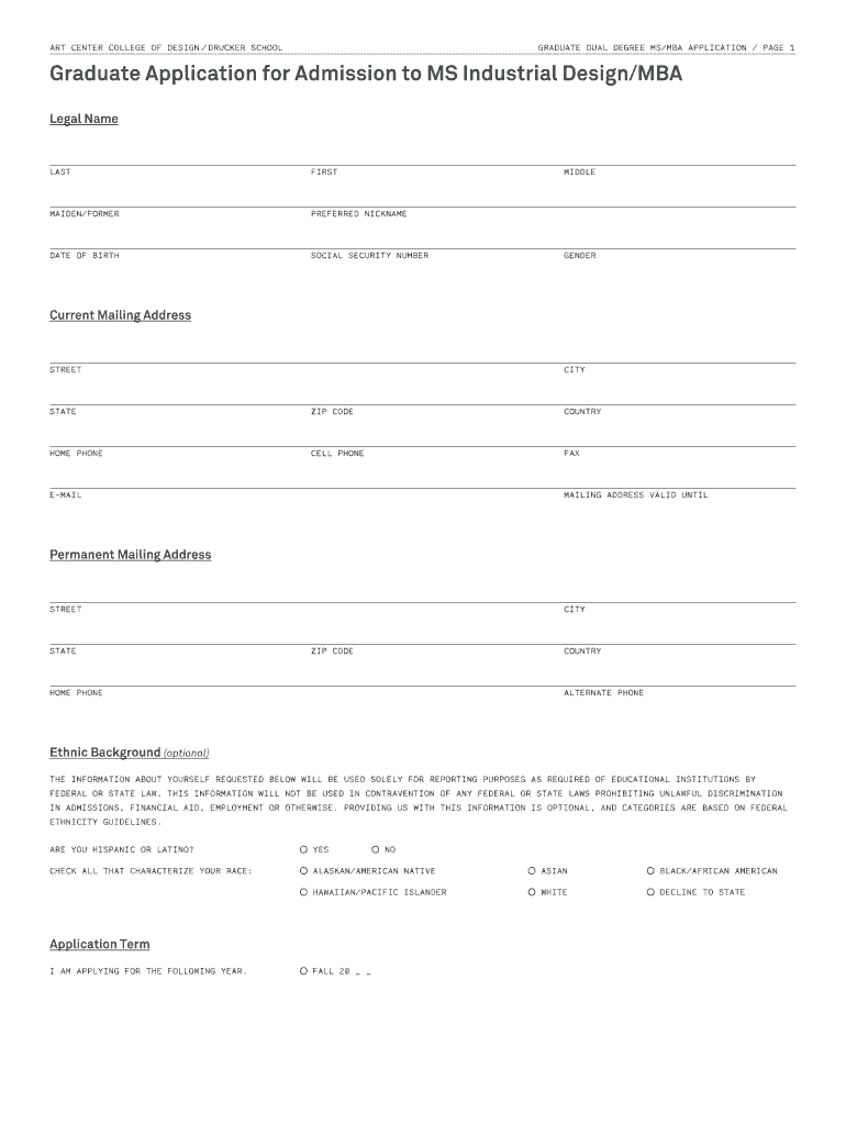 ART CENTER COLLEGE OF DESIGN? TRUCKER SCHOOL /? GRADUATE DUAL DEGREE MS/MBA APPLICATION / PAGE 1 Graduate Application for Admission to MS Industrial Design/MBA Legal Name LAST FIRST MAIDEN/FORMER