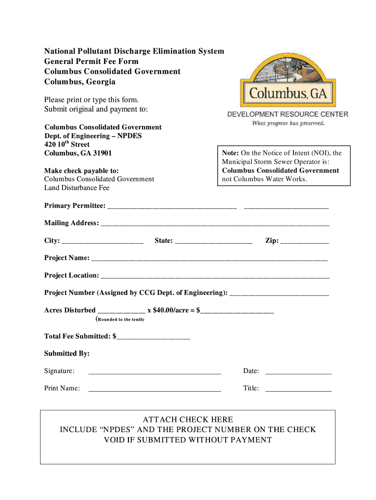 National Pollutant Discharge Elimination System General Permit Fee Form Columbus Consolidated Government Columbus, Georgia Please print or type this form. Submit original and payment to: Columbus