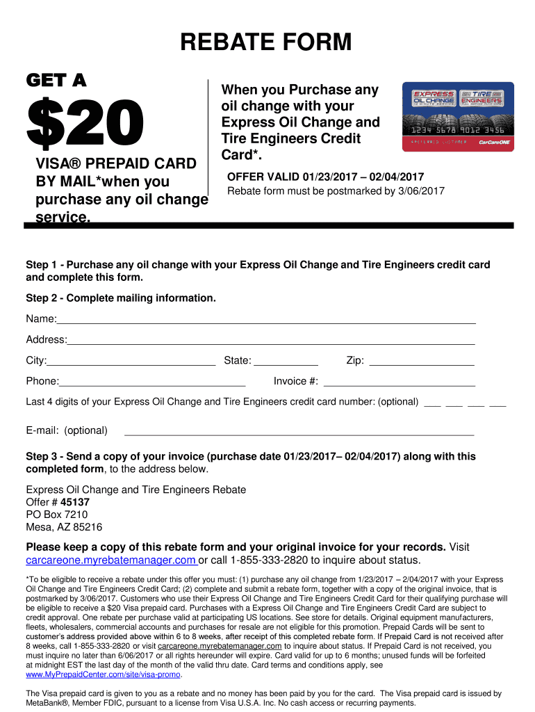 REBATE FORM GET A ×20 VISA PREPAID CARD BY MAIL×when you purchase any oil change service. When you Purchase any oil change with your Express Oil Change and Tire Engineers Credit Card×. OFFER VALID