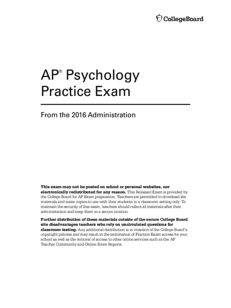 AP Psychology Practice Exam From the 2016 Administration This exam may not be posted on school or personal websites, nor electronically redistributed for any reason. This Released Exam is provided