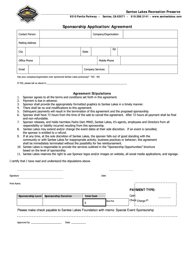 San tee Lakes Recreation Preserve 9310 Anita Parkway San tee, CA 92071 619.596.3141 www.santeelakes. Com Sponsorship Application/Agreement Contact Person Company/Organization Mailing Address City