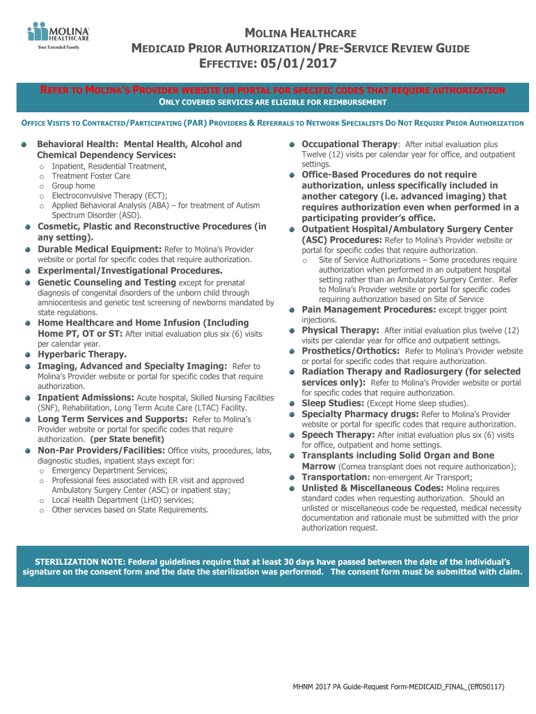MOLINA HEALTHCARE MEDICAID PRIOR AUTHORIZATION/PRESERVICE REVIEW GUIDE EFFECTIVE: 05/01/2017 REFER TO MOLINA PROVIDER WEBSITE OR PORTAL FOR SPECIFIC CODES THAT REQUIRE AUTHORIZATION ONLY COVERED SERVICES