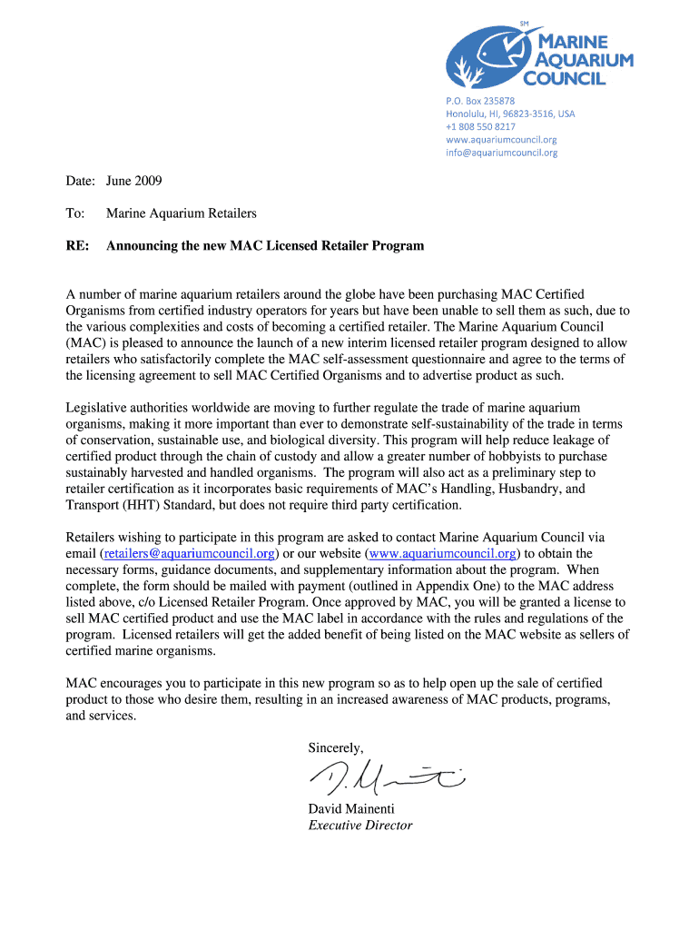 P.O. Box235878 Honolulu, HI,968233516,USA +18085508217 www.aquariumcouncil.org info aquarium council.org Date: June 2009 To: Marine Aquarium Retailers RE: Announcing the new MAC Licensed Retailer