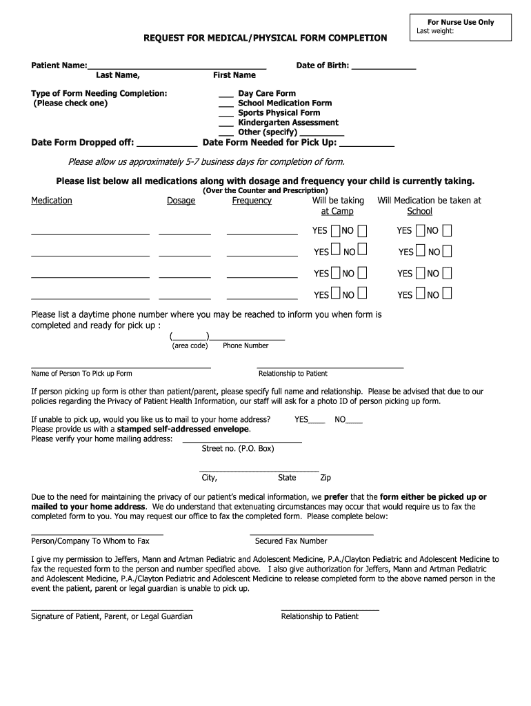 For Nurse Use Only Last weight: REQUEST FOR MEDICAL/PHYSICAL FORM COMPLETION Patient Name: Last Name, First Name Type of Form Needing Completion: (Please check one) Date of Birth: Day Care Form School