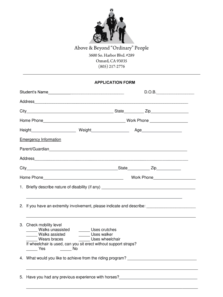 APPLICATION FORM Students Name D.O.B. Address City State Zip Home Phone Work Phone Height Weight Age Emergency Information Parent/Guardian Address City State Zip Home Phone Work Phone 1. Briefly describe