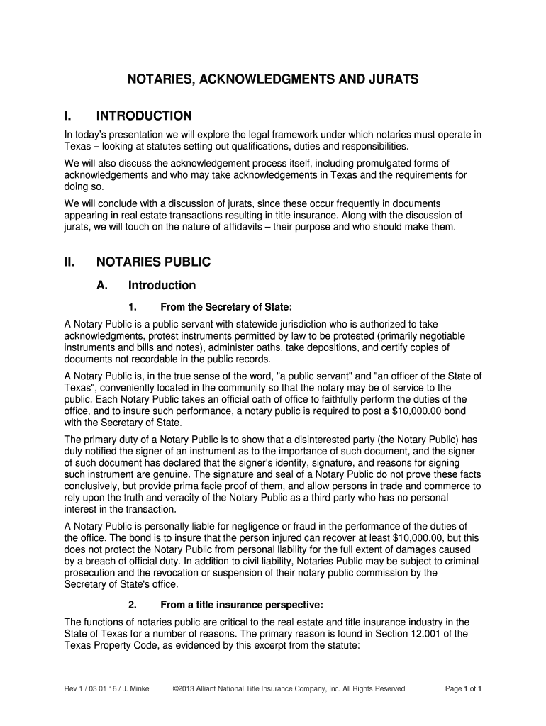 NOTARIES, ACKNOWLEDGMENTS AND RATS I. INTRODUCTION In today's presentation we will explore the legal framework under which notaries must operate in Texas looking at statutes setting out qualifications,