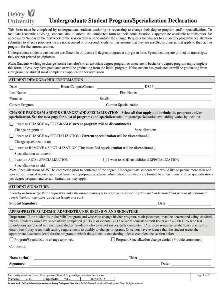 Get the free Undergraduate Student Program-Specialization Declaration Form 7-6-15docx - add devry