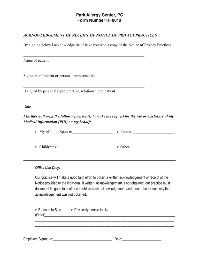 Park Allergy Center, PC Form Number HF001a ACKNOWLEDGEMENT OF RECEIPT OF NOTICE OF PRIVACY PRACTICES By signing below I acknowledge that I have received a copy of the Notice of Privacy Practices.
