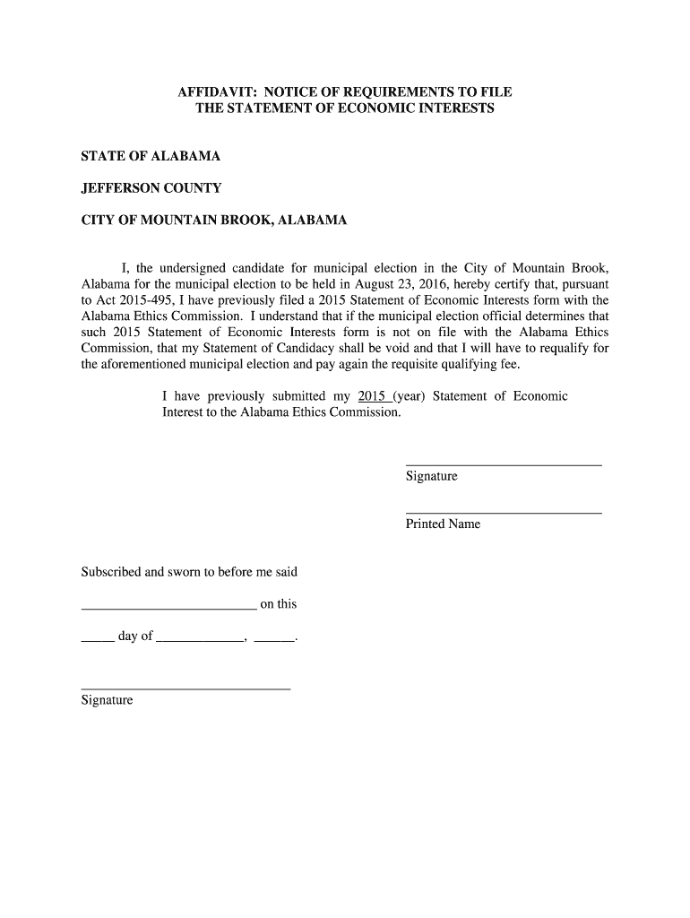 AFFIDAVIT: NOTICE OF REQUIREMENTS TO FILE THE STATEMENT OF ECONOMIC INTERESTS STATE OF ALABAMA JEFFERSON COUNTY CITY OF MOUNTAIN BROOK, ALABAMA I, the undersigned candidate for municipal election