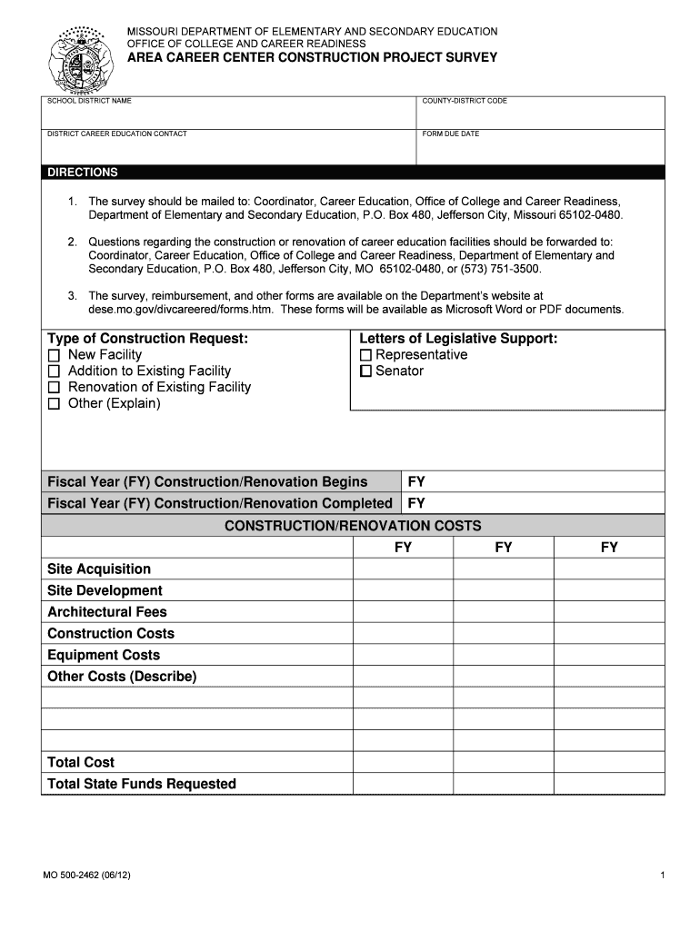 MISSOURI DEPARTMENT OF ELEMENTARY AND SECONDARY EDUCATION OFFICE OF COLLEGE AND CAREER READINESS AREA CAREER CENTER CONSTRUCTION PROJECT SURVEY SCHOOL DISTRICT NAME COUNTYDISTRICT CODE DISTRICT CAREER