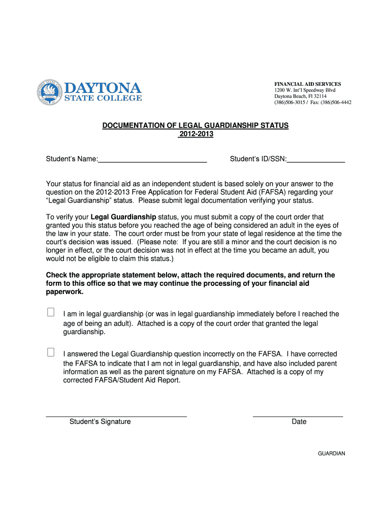 FINANCIAL AID SERVICES 1200 W. Into Speedway Blvd Daytona Beach, Fl 32114 (386)5063015 / Fax: (386)5064442 DOCUMENTATION OF LEGAL GUARDIANSHIP STATUS 20122013 Students Name: Students ID/SSN: Your