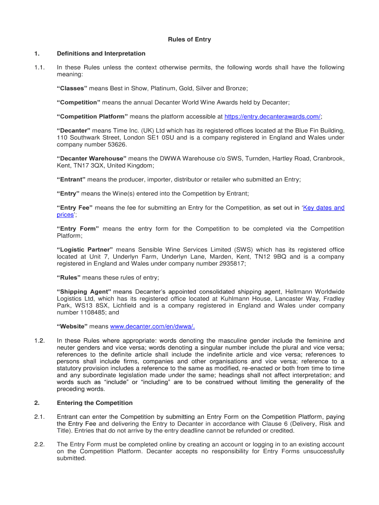 Rules of Entry 1. Definitions and Interpretation 1.1. In these Rules unless the context otherwise permits, the following words shall have the following meaning: Classes means Best in Show, Platinum,
