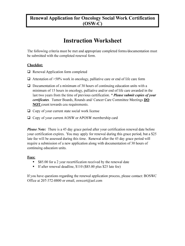 Renewal Application for Oncology Social Work Certification (OSC) Instruction Worksheet The following criteria must be met and appropriate completed forms/documentation must be submitted with the completed