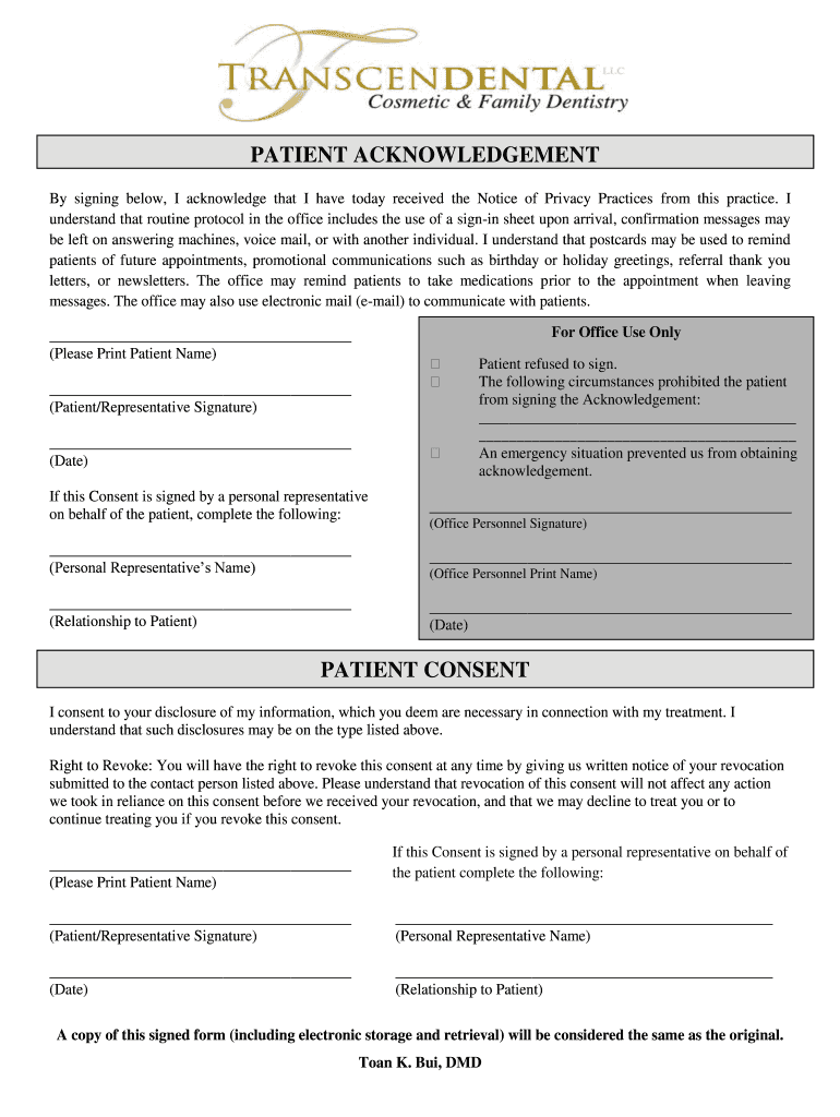 By signing below, I acknowledge that I have today received the Notice of Privacy Practices from this practice. I