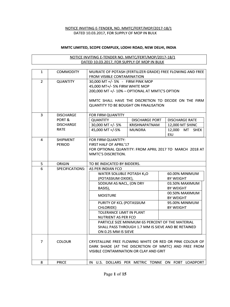 NOTICE INVITING TENDER, NO. MTC/FERT/MOP/201718/1 DATED 10.03.2017, FOR SUPPLY OF MOP IN BULK MTC LIMITED, SCOPE COMPLEX, LODI ROAD, NEW DELHI, INDIA NOTICE INVITING TENDER NO. MTC/FERT/MOP/201718/1
