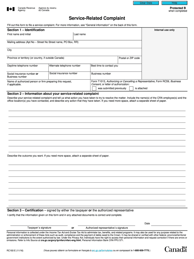 Clear Data Help Protected B when completed ServiceRelated Complaint Fill out this form to file a service complaint. For more information, see “General information on the back of this form. Section
