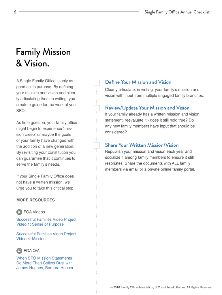 TM SINGLE FAMILY OFFICE BEST PRACTICES CHECKLIST ABOUT THE CHECKLIST This is a comprehensive guide to reviewing the important aspects of single family office operations to ensure best practice alignment,