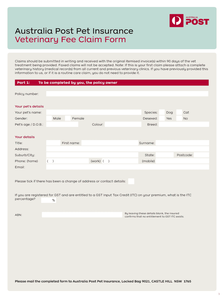 Australia Post Pet Insurance Veterinary Fee Claim Form Claims should be submitted in writing and received with the original itemized invoice(s) within 90 days of the vet treatment being provided.