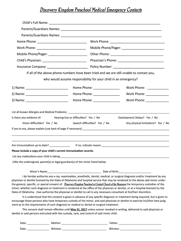 Discovery Kingdom Preschool Medical Emergency Contacts Child's Full Name: Parents/Guardians Names: Parents/Guardians Names: Home Phone: Work Phone: Work Phone: Mobile Phone/Pager: Mobile Phone/Pager: