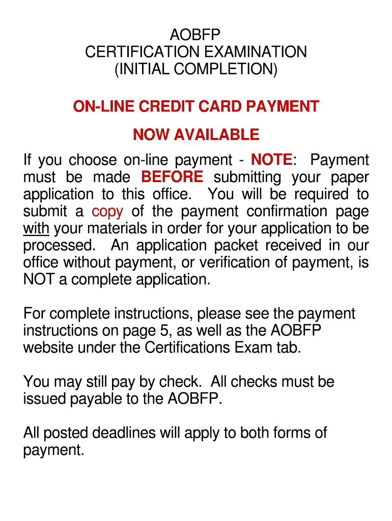 AO BFP CERTIFICATION EXAMINATION (INITIAL COMPLETION) ONLINE CREDIT CARD PAYMENT NOW AVAILABLE If you choose online payment NOTE: Payment must be made BEFORE submitting your paper application to this