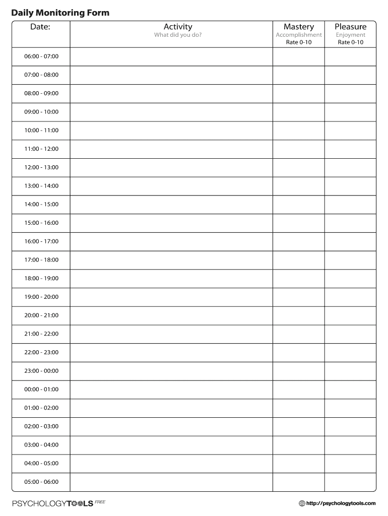 Daily Monitoring Form Date: Activity What did you do? Mastery Accomplishment Rate 010 Pleasure Enjoyment Rate 010 06:00 07:00 07:00 08:00 08:00 09:00 09:00 10:00 10:00 11:00 11:00 12:00 12:00 13:00