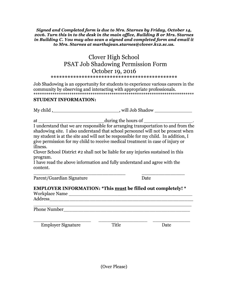 Get the free Clover High School PSAT Job Shadowing Permission Form ... - clover k12 sc