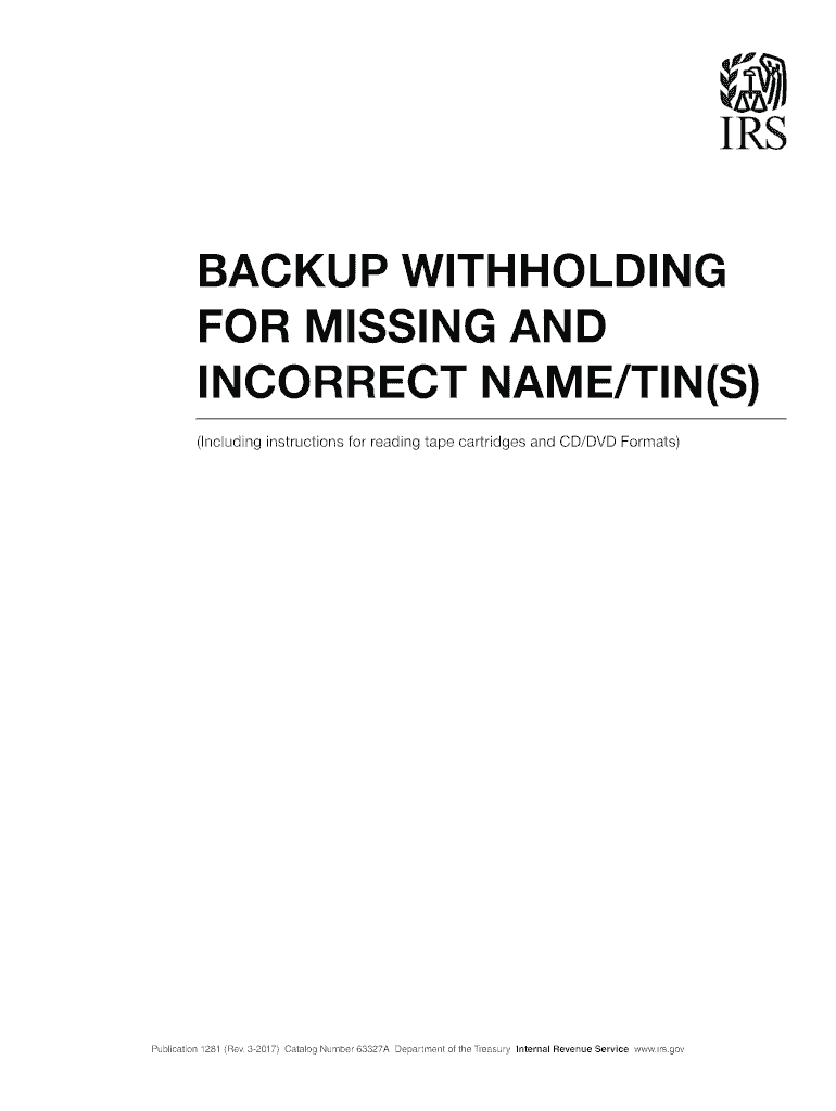 BACKUP WITHHOLDING FOR MISSING AND INCORRECT NAME/TIN(S) (Including instructions for reading tape cartridges and CD/DVD Formats) Publication 1281 (Rev. 32017) Catalog Number 63327A Department of the