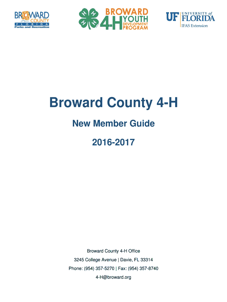 Broward County 4H New Member Guide 20162017 Broward County 4H Office 3245 College Avenue Davie, FL 33314 Phone: (954) 3575270 Fax: (954) 3578740 4H Broward.org July2016 Table of Contents Welcome Letter.