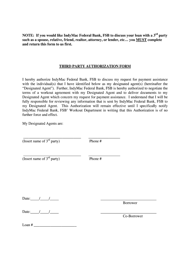 NOTE: If you would like Indy Mac Federal Bank, FSB to discuss your loan with a 3rd party such as a spouse, relative, friend, realtor, attorney, or lender, etc you MUST complete and return this form